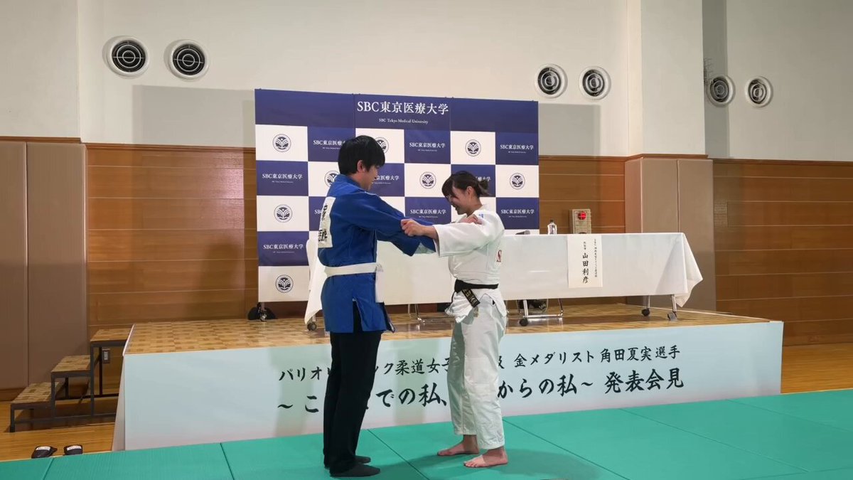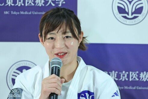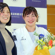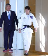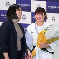 | 引退記者会見に臨む角田 引退記者会見に臨むパリ五輪柔道女子48キロ級金メダリストの角田夏実(手前)。奥はSBC湘南美容クリニック柔道部の山田利彦総監督=30日、千葉県浦安市 (出典:時事通信) |