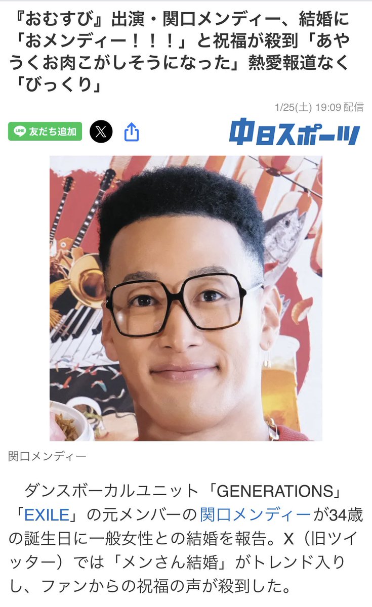 | 『おむすび』出演・関口メンディー、結婚に「おメンディー!!!」と祝福が殺到「あやうくお肉こがしそうになった」熱愛報道なく「びっくり」 …「EXILE」の元メンバーの関口メンディーが34歳の誕生日に一般女性との結婚を報告。X(旧ツイッター)では「メンさん結婚」がトレンド入りし、ファンから… (出典:) |