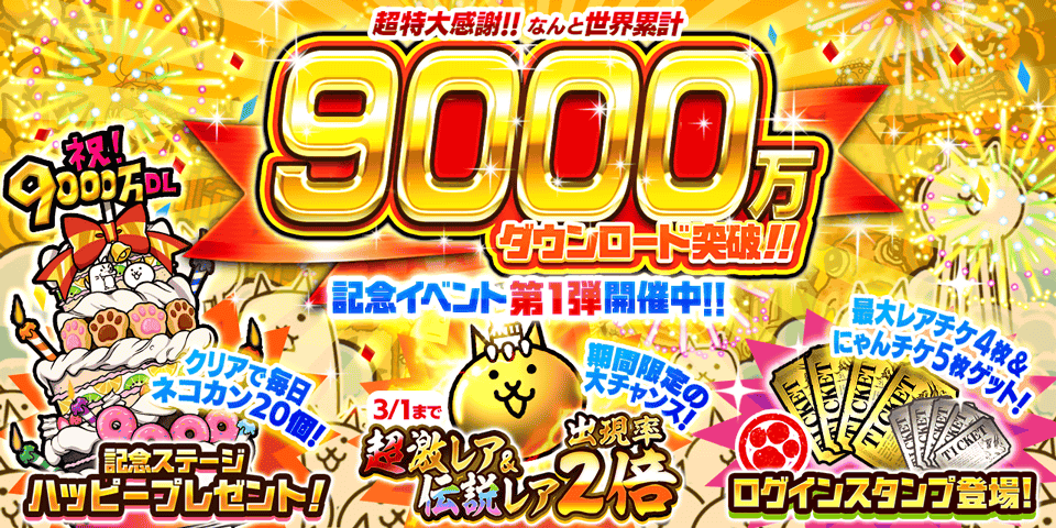 | 最古参級スマホゲーム「にゃんこ大戦争」累計1億DL突破 新CMも放送開始 …900万ダウンロードを突破していた。 記念イベントの目玉となる「1億ダウンロード記念チャレンジ」では、ユーザーが協力して記念ミッションに挑戦。クリア人… (出典:) |